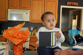 Well kids as you know Griffin is growing like crazy and really starting to show his personality! Right now he crawls all over the place, can stand on his own and can walk around the coffee table holding on. My guess is he will be walking January 11th.